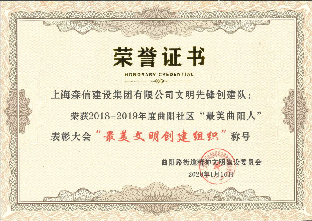 2020年1月16日下午,2018—2019年度曲陽(yáng)社區(qū)“最美曲陽(yáng)人”表彰大會(huì)暨迎新春聯(lián)歡會(huì)在 上海外國(guó)語(yǔ)大學(xué)逸夫會(huì)堂舉行,我司申報(bào)的“文明先鋒創(chuàng)建隊(duì)”榮獲 曲陽(yáng)社區(qū)“最美文明創(chuàng)建組織”稱號(hào)。