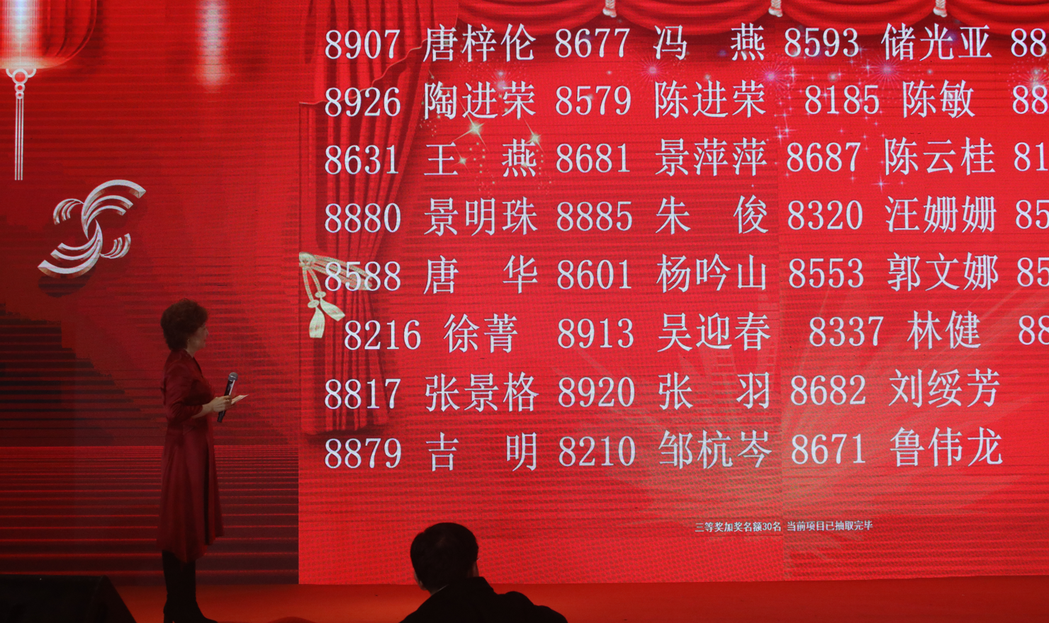 抽獎(jiǎng)活動(dòng)將現(xiàn)場(chǎng)氣氛推向高潮,每一位中獎(jiǎng)的幸運(yùn)兒都踩著愉悅的步伐奔向領(lǐng)獎(jiǎng)臺(tái),看著身旁的獎(jiǎng)品,大家臉上都綻放出了燦爛的笑容。抽獎(jiǎng)活動(dòng)在一片祥和的氣氛中結(jié)束。本次晚會(huì)共安排有一、二、三等獎(jiǎng)及“陽(yáng)光普照”獎(jiǎng)。