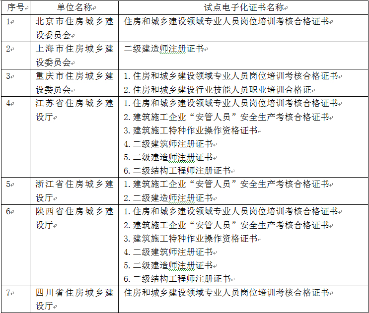 為進一步推動建筑業(yè)改革發(fā)展,提高政務服務效能,經(jīng)研究,同意北京市、上海市、重慶市、江蘇省、浙江省、陜西省、四川省開展住房和城鄉(xiāng)建設(shè)領(lǐng)域從業(yè)人員相關(guān)證書電子化試點,電子化證書與紙質(zhì)證書具有同等效力。電子化試點證書名稱詳見附件。